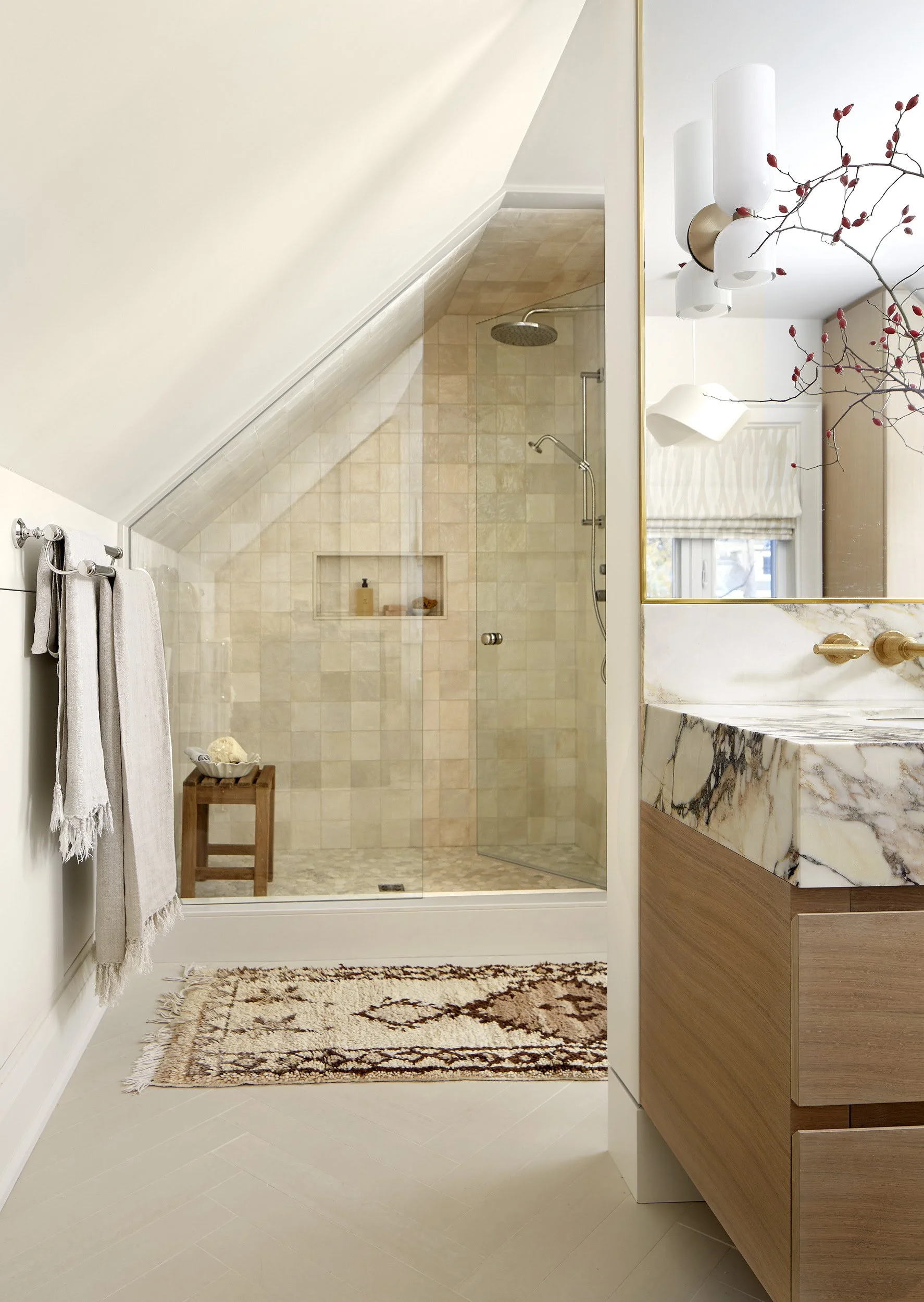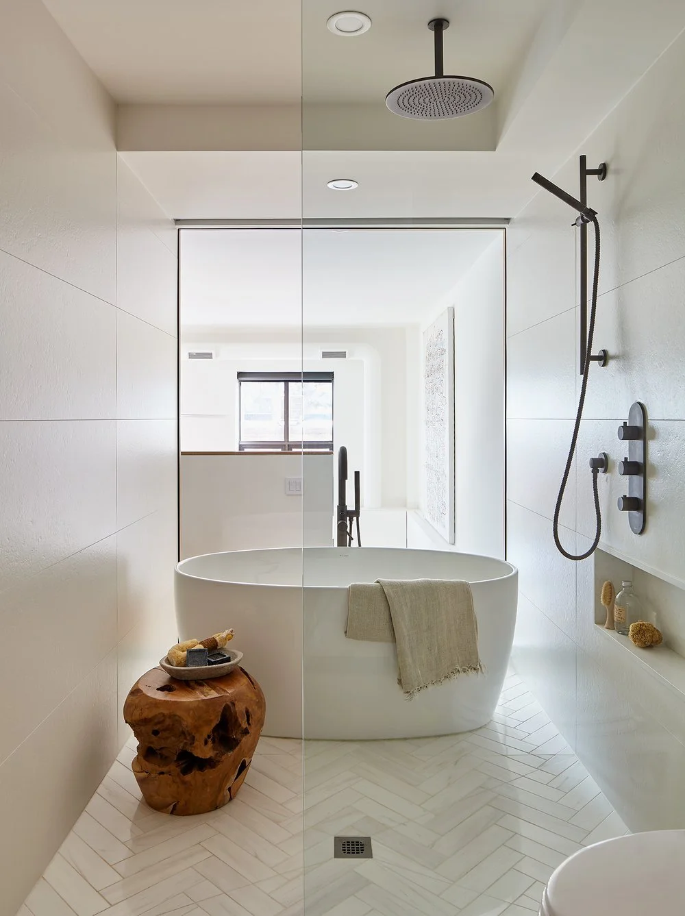 If you have the opportunity to bring in natural light, do it. There’s nothing better than daylight to make a space feel more open and well-lit. The principal ensuite at our Logan Loft (image below) didn’t have any natural light in the existing bathroom, so we removed one of the walls and installed a large fixed window. We also created a wet room by stacking the tub and shower back-to-back. Now, the light pours in and there’s a hidden motorized blind for when privacy is needed.