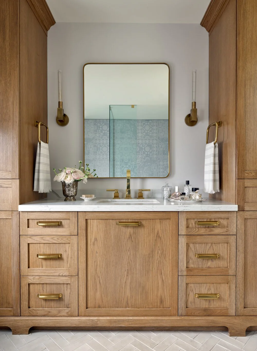 In our Hamby bathroom (top image), we carved out an area in the room for a custom make-up/hair station to free up space on the vanity. And in our West End bathroom (above image), we went with only one sink, but flanked it with two tall storage towers to meet the family's major storage needs.