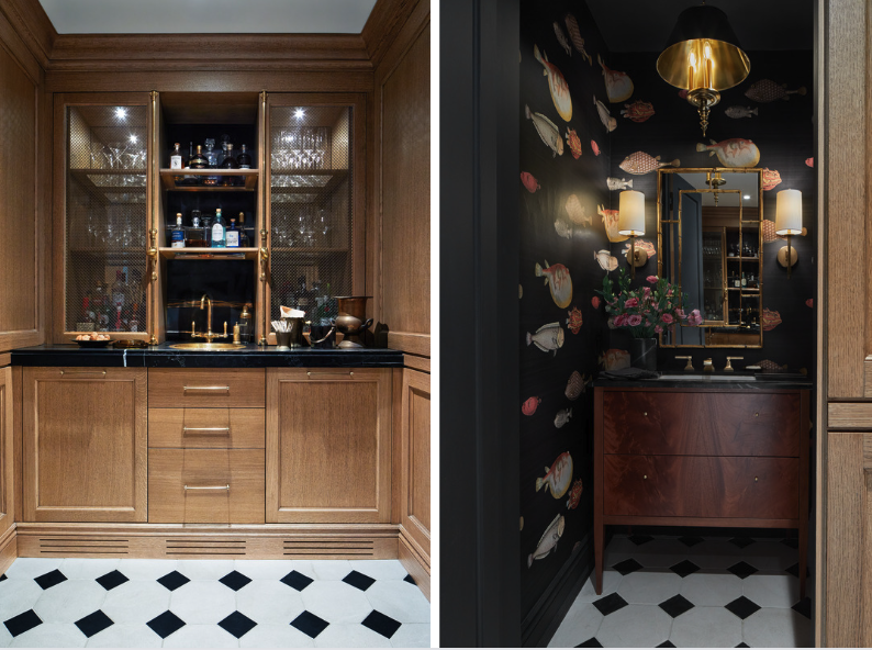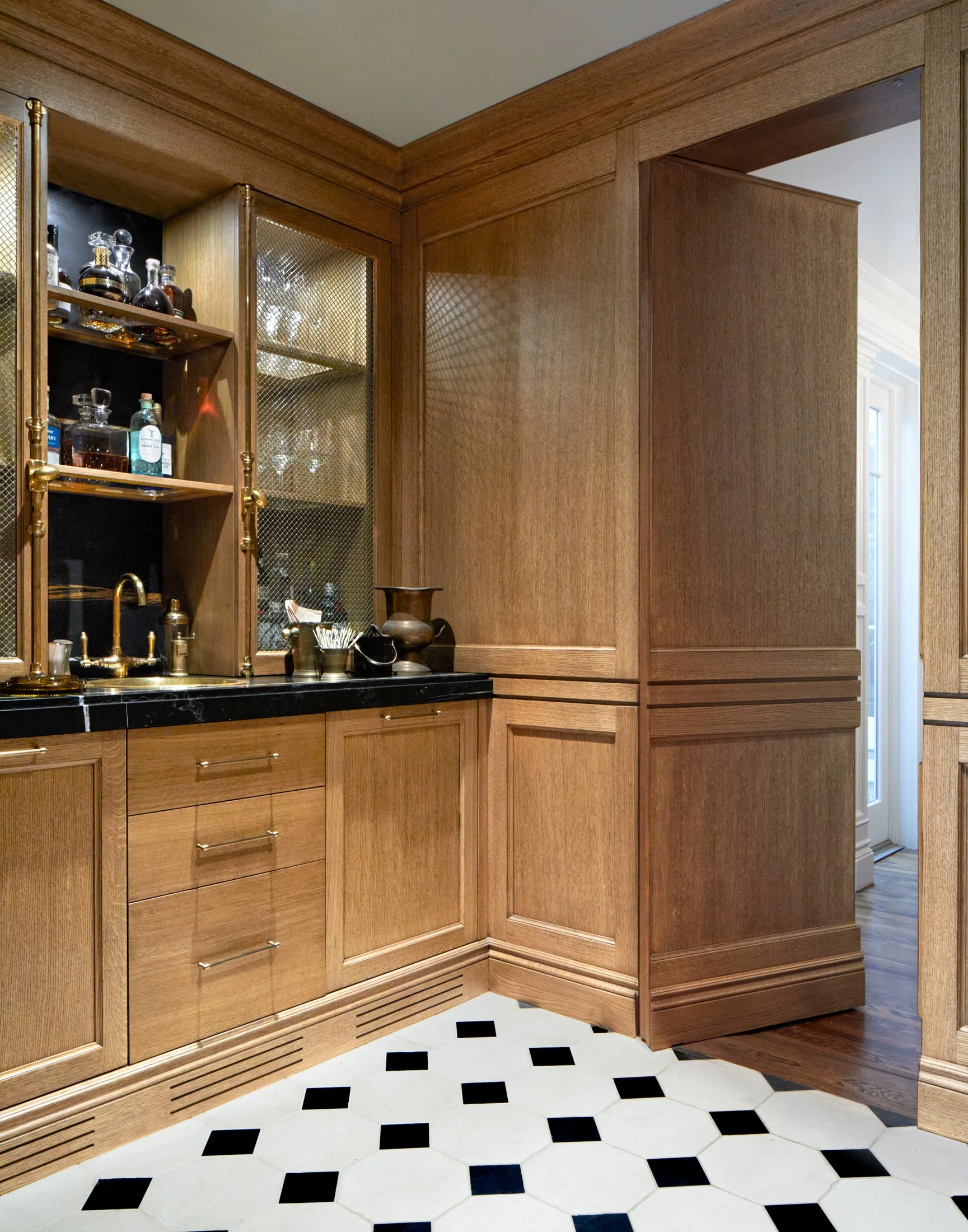 The transition space between the Kitchen (end of the original house) and the Great Room was transformed into a Gentleman's Bar with beautiful wood panelled oak walls, limestone floors, a fully functioning bar and secret jib doors leading into the Kitchen and Powder Room.